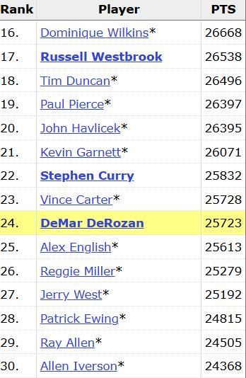 在德羅贊身前的是勇士球星斯蒂芬-庫里,后者以25832分排名歷史第22位,兩人相差100分左右。