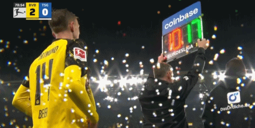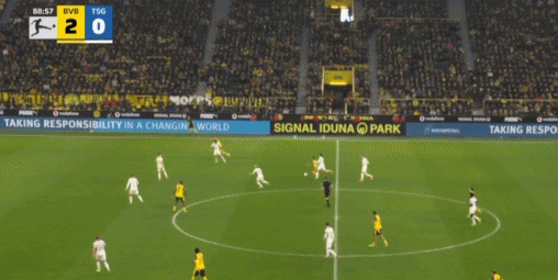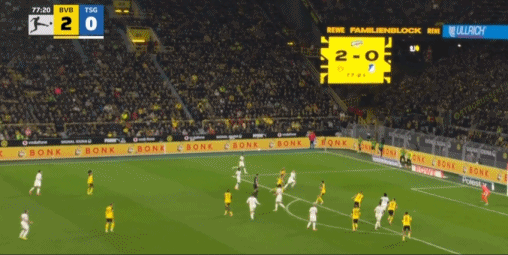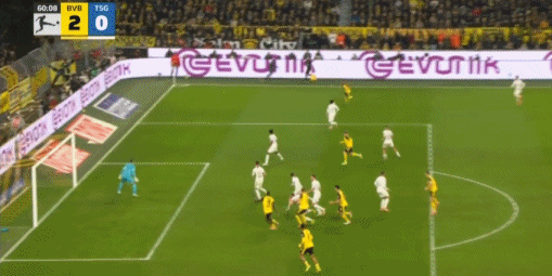 第43分鐘,打破僵局,揚-科托助攻布蘭特破門,多特1-0霍芬海姆