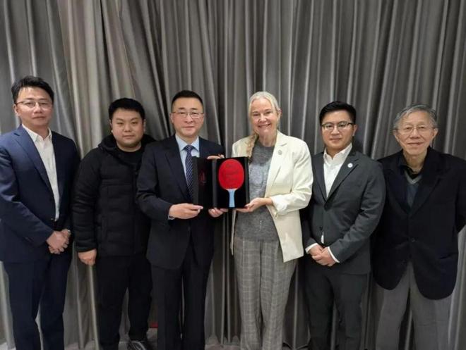 2025年12月6日,上海體育大學校務委員會主席李崟和國際乒聯主席、國際奧委會委員佩特拉·索林女士在成都會面交流,共商國際乒聯博物館和中國乒乓球博物館(以下簡稱“乒博館”)發展事宜。索林女士在交流中將法國總統埃馬紐埃爾·馬克龍簽名球拍正式移交予乒博館,該球拍是馬克龍總統近日到訪四川成都觀摩2025年國際乒聯混合團體世界杯賽事時,親筆寫下簽名并贈予索林主席的特殊禮物。這一球拍不僅是中法乒乓球交流活動中友好互動的珍貴延續,也再次彰顯了乒乓球運動作為外交橋梁的持久生命力和獨特價值。